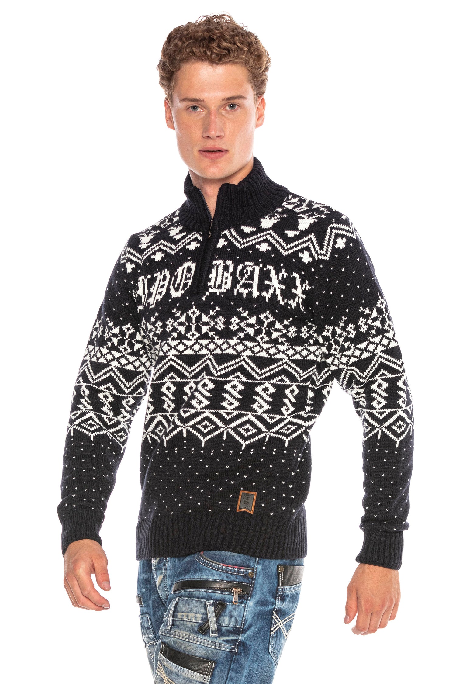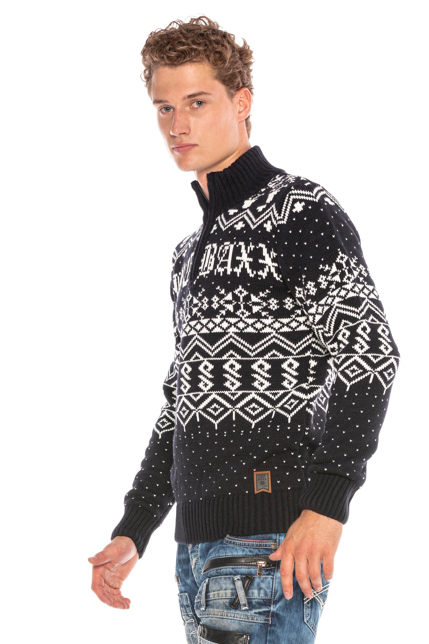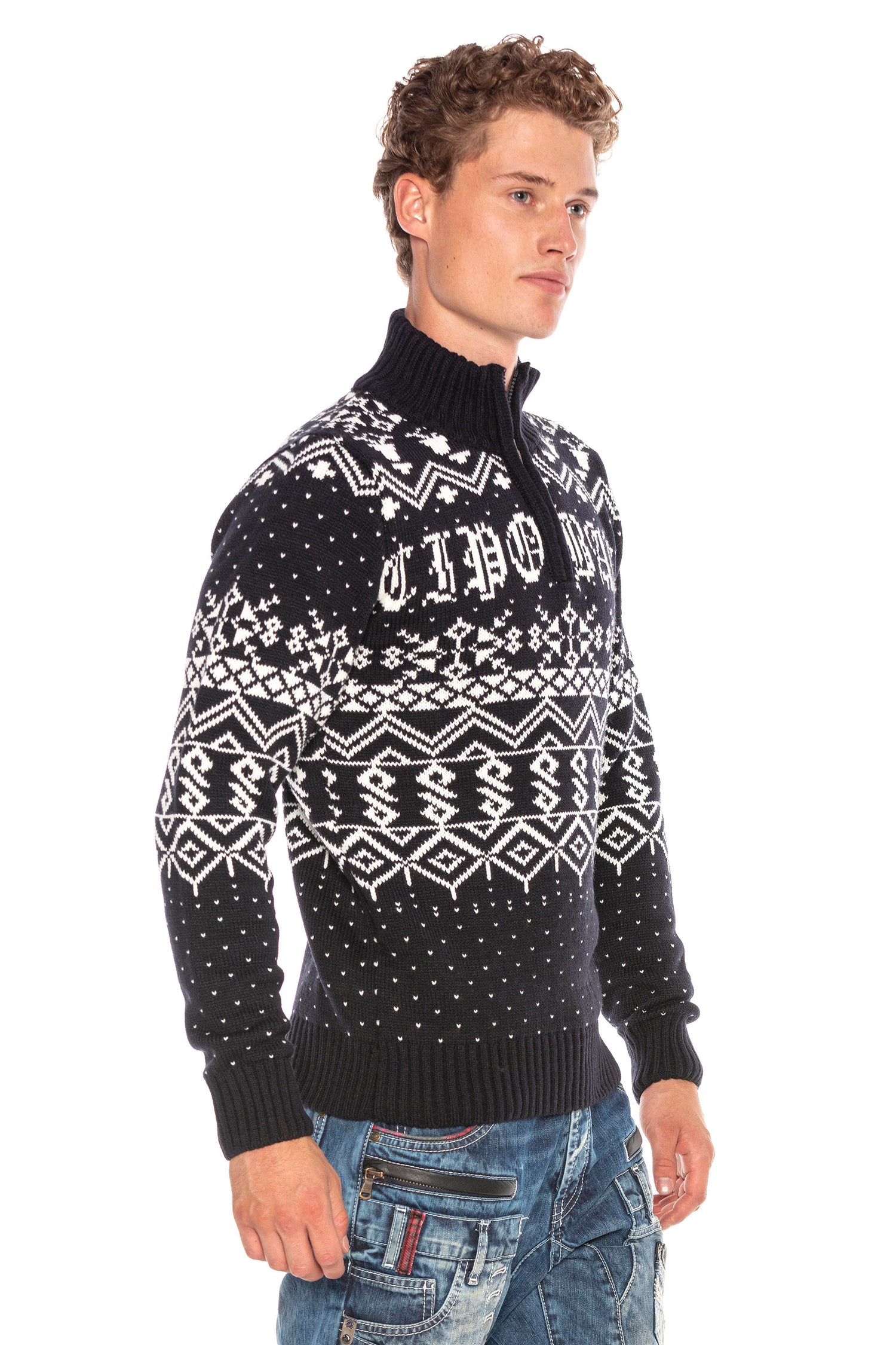 CP233 Dik Yaka Fermuarlı Desenli Kalın Kazak - DARKBLUE / S